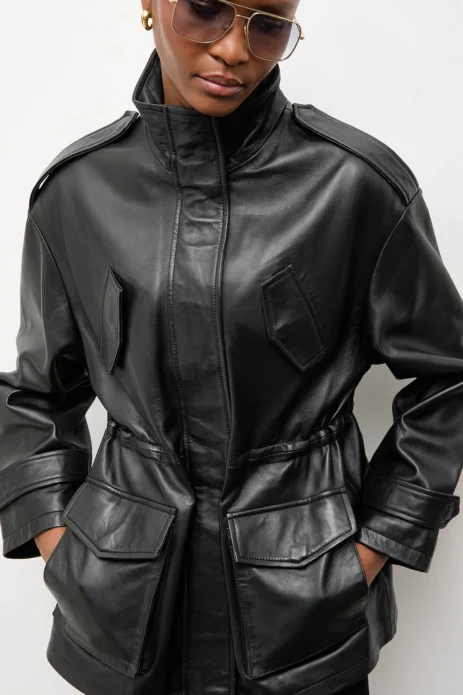 Kožená bunda v hnedom odtieni so štyrmi výraznými vreckami na prednej strane. Má nastaviteľné manžety a zapínanie na skryté cvoky.